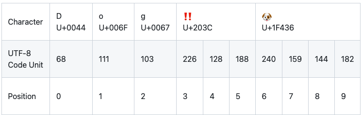 上面的例子中,前三个 10 进制 codeUnit 值(68、111、103)代表了字符 D、o 和 g,它们的 UTF-8 表示与 ASCII 表示相同。接下来的三个 10 进制 codeUnit 值(226、128、188)是 DOUBLE EXCLAMATION MARK 的3字节 UTF-8 表示。最后的四个 codeUnit 值(240、159、144、182)是 DOG FACE 的4字节 UTF-8 表示。