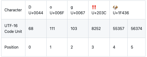第五和第六个 codeUnit 值(55357 和 56374)是 DOG FACE 字符的 UTF-16 表示。第一个值为 U+D83D(十进制值为 55357),第二个值为 U+DC36(十进制值为 56374)。